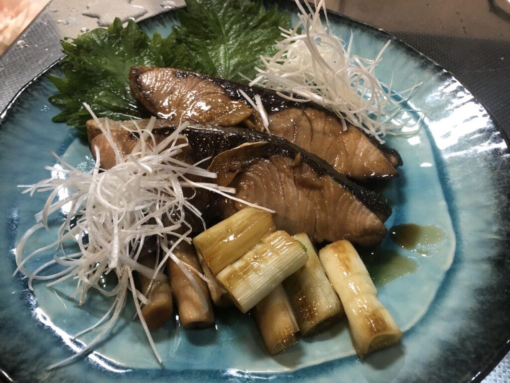 鰤は甘辛く煮つけ白髪ねぎを添えて。