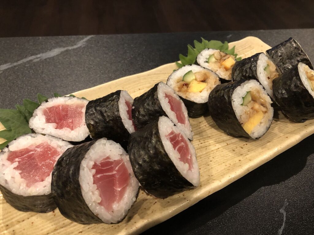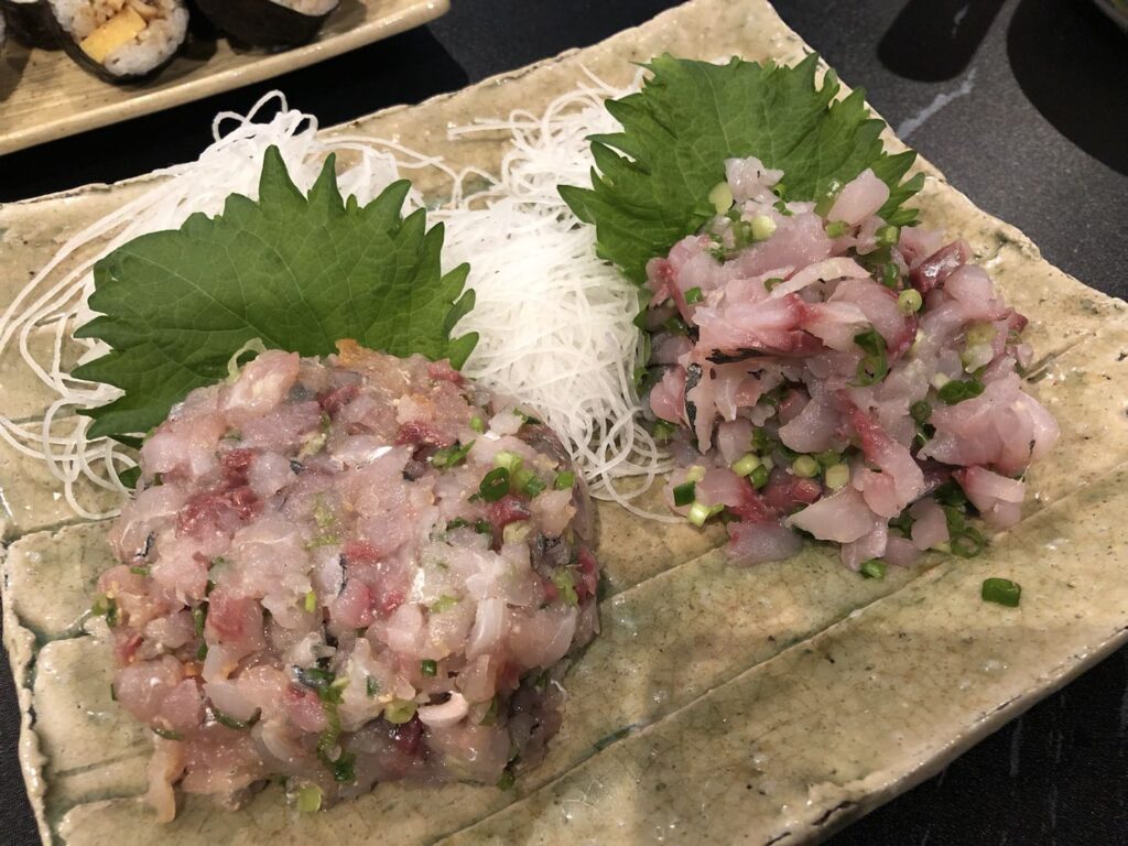 先ずはカツラ剥きにしたツマを添えて。生マグロは一味違いますね。